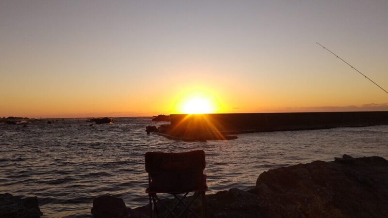 私は一旦痺れを切らし、状況を変えるべく近くの漁港へ偵察に向かいました。しかし、他の釣り人たちも「釣れていない」という厳しい状況。「今は耐える時か……」と元の場所へ戻り、海を眺めながらおにぎりを頬張ります。
