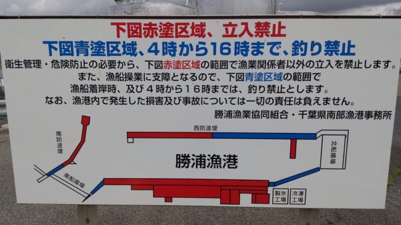 - 4時から16時までは釣り禁止: 勝浦漁港で釣りができるのは、看板の青い箇所で夕方16時から翌日4時までとなります。