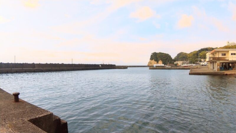勝浦漁港から西へ車で約10分の場所にある興津港は、クロダイやメジナなどの良型が狙える本格派の釣り場です。港内は落ち着いた雰囲気で、地元の釣り人にも人気。