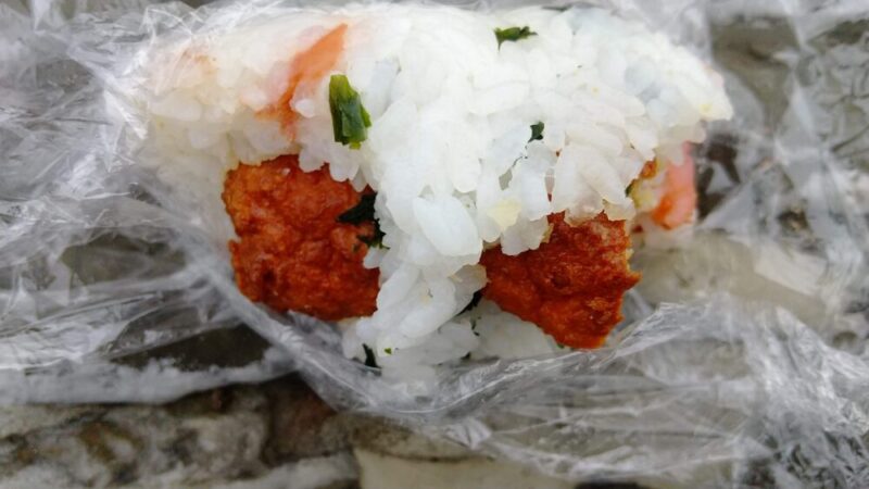しかし、ここまで遅れてしまったら、もう焦っても仕方がありません。潮風に吹かれながら、「まずは腹ごしらえをしよう」と親父と二人、腰を下ろしました。そこで取り出したのは、妻が持たせてくれた手作りのおにぎりです。